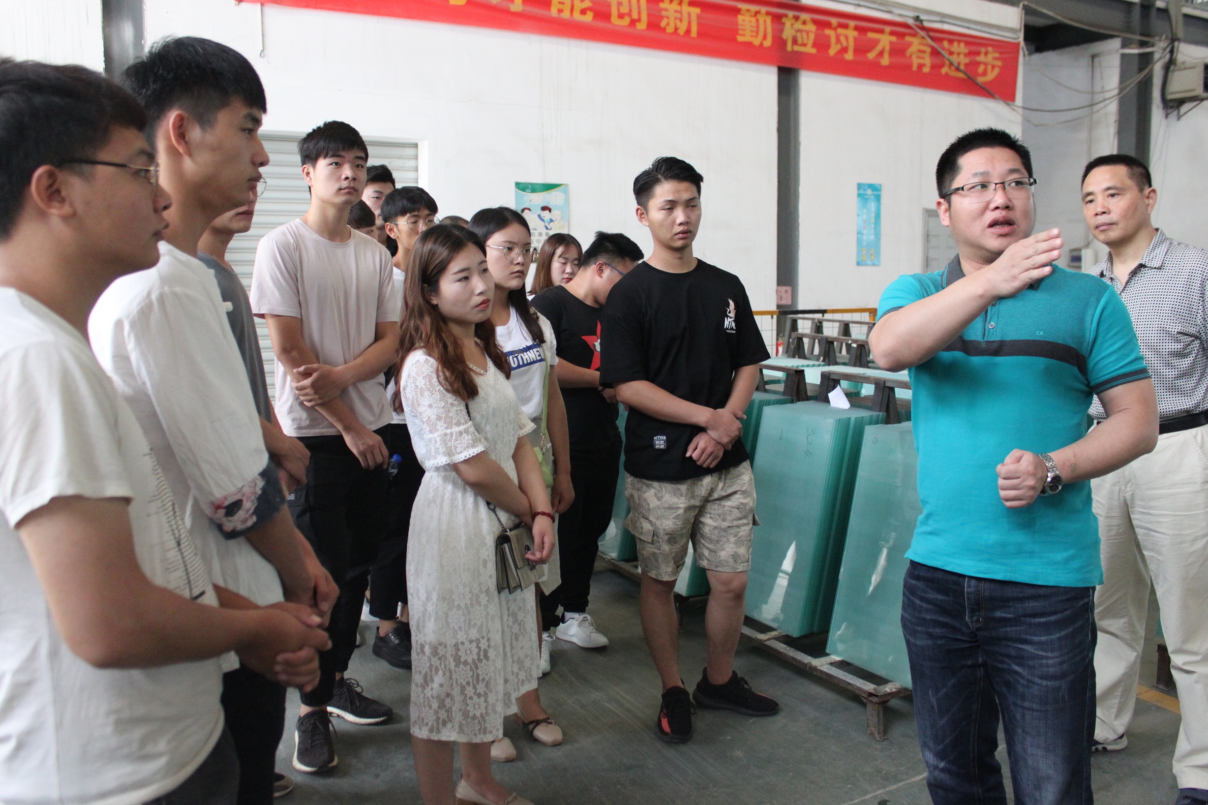 彩晶事業部長魏常宏的帶領下,綜合管理部葉、行政經理馬向明的陪同下,我們來到了參觀的第一站:彩晶事業部制一部生產車間。魏部長細心的給同學們講解,并讓同學們看到了每一片玻璃從進廠、到切割、加工、打磨、水洗,到合格的離開這個廠區。車間機械的轟鳴聲,絲毫不減同學們的興趣與激情,同學們緊跟著隊伍,仔細的觀看,認真的聆聽,雖然聽得也只是只字片語,但從同學們頻頻點頭可以看出,同學們都心領神會。