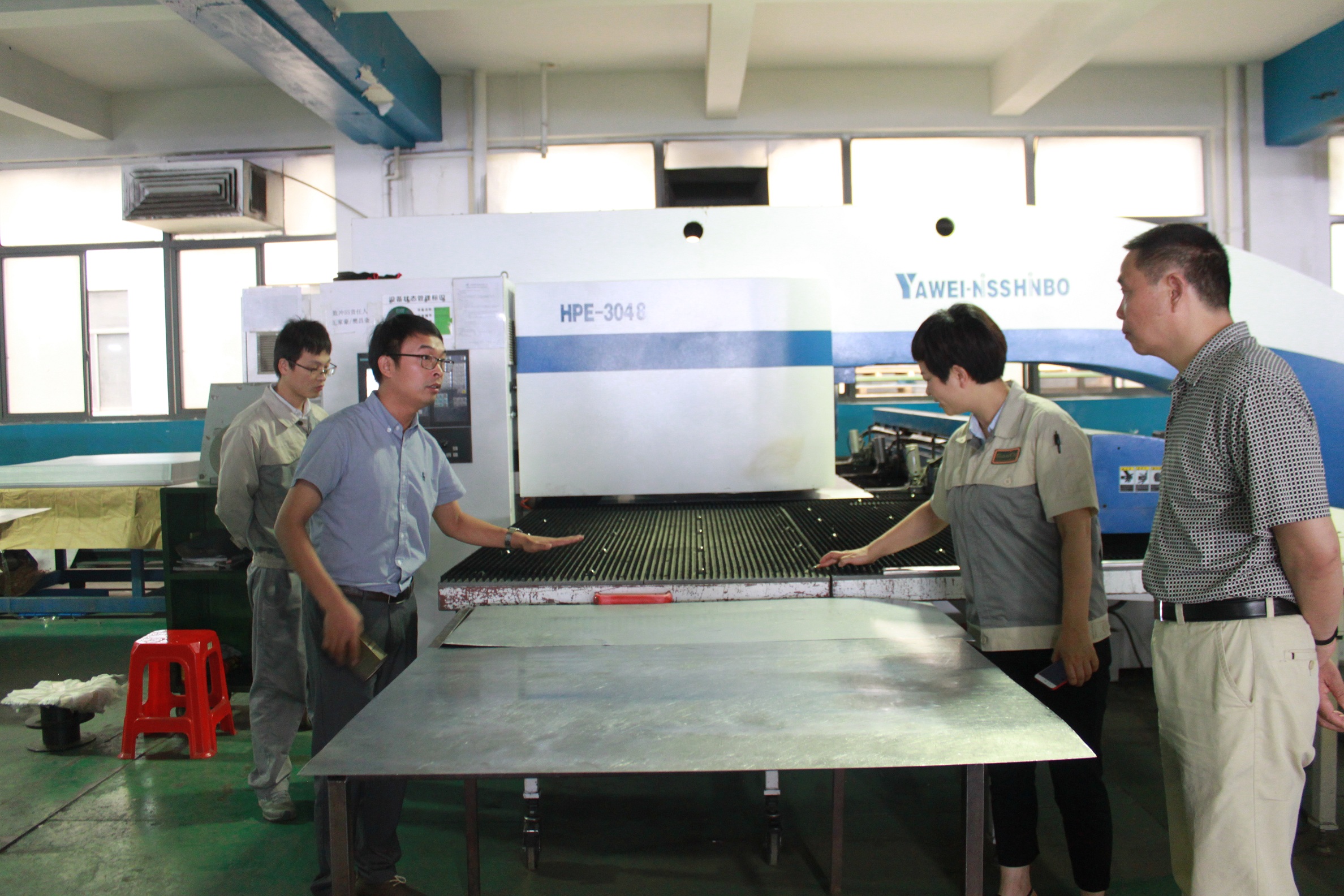 參觀的第三站:鈑金加工部,由部長助理李大奎帶隊,李助理詳細介紹了每一個鈑金件的切割下料、沖裁加工、彎壓成形等工序,并在設備上實際操作了一番。