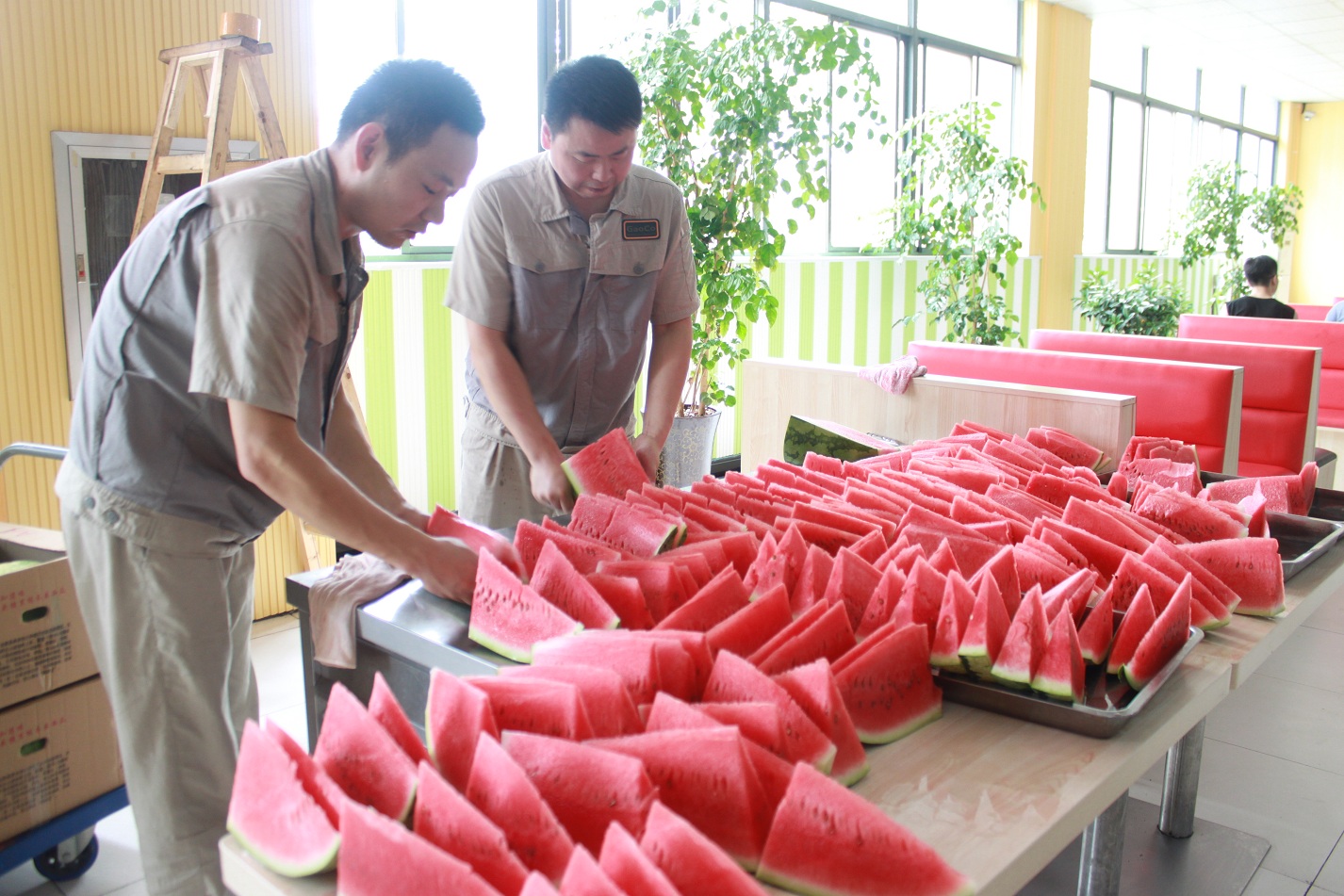 臨時中餐開餐時間,工作人員已將西瓜切好,西瓜流出紅色的果汁,讓人不由得咽下口水!片片西瓜守在自己的“崗位”上,等候著為我們辛苦的員工們解暑釋放!