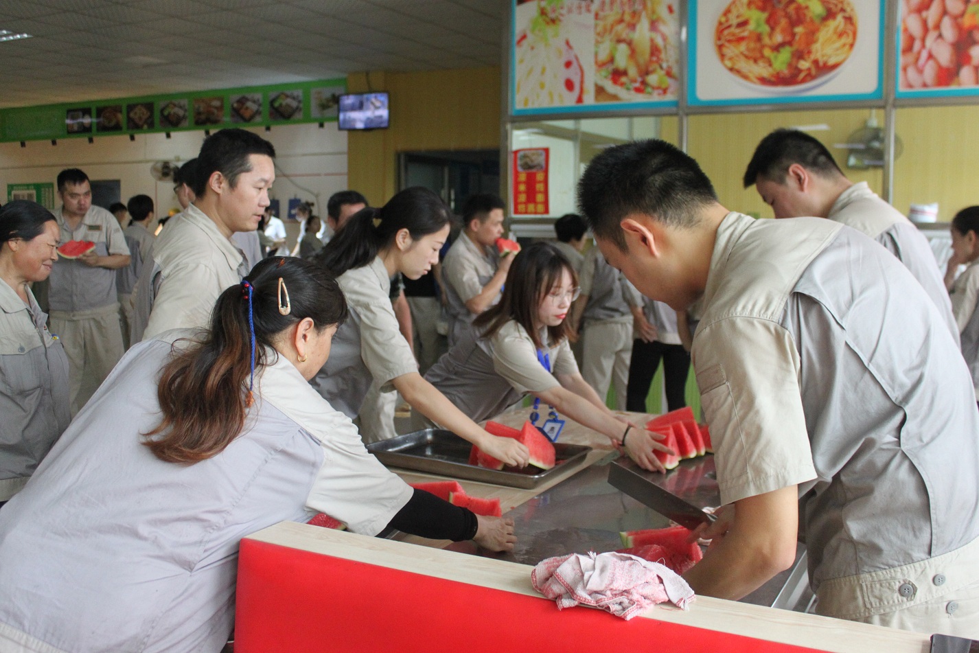 開餐時間到了,員工陸續來到餐廳,帶著一身暑氣,拿起西瓜咬了一口,從他們豆大汗珠的臉上,能感受到那份幸福與清涼。