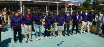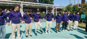 首個重磅項目——“十人九足一圈到底”協(xié)同賽,將賽事推向了第一個高潮。這是一個極其考驗團隊協(xié)調(diào)性與統(tǒng)一性的復合型項目,要求十名隊員不僅要用綁帶將相鄰的腿兩兩綁住,形成“十人九條腿”的奇特模式協(xié)同前行,還需在到達終點后共同協(xié)作,讓一個呼啦圈穿過所有人的身體,完成“一圈到底”。